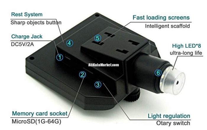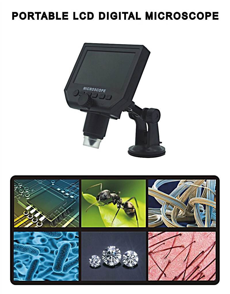 میکروسکوپ دیجیتالی قابل حمل مدل G600 به کمک یک لنز حرفه ای و سنسور دوربین 3.6 مگاپیکسلی تصاویر شفاف از اجسام را به شما ارائه می دهد که از این تصاویر می توانید در کارت حافظه قابل اتصال به این میکروسکوپ، عکس برداری و فیلم برداری کنید. نمایشگر 4.3 اینچی این لوپ الکترونیکی شما را از اتصال آن به کامپیوتر و سایر لوازم الکترونیکی بی نیاز می کند و به آن قابلیت جابجایی و استفاده در مکان های مختلف می بخشد. این نمایشگر قابلیت نمایش تصاویر با کیفیت را ارائه می دهد. باتری قابل شارژ لیتومی این میکروسکوپ قابلیت کار بیشتر از 6 ساعت را دارد. هشت عدد ال ای دی تعبیه شده در زیر این لوپ الکترونیکی قابلیت مشاهده اجسام را در نور کم ممکن می سازد. در بسته بندی اصلی این محصول دفترچه راهنمای انگلیسی، آداپتور استاندارد (بدون نیاز به مبدل مانند تصویر)، کابل یو اس بی و پایه نگهدارنده میکروسکوپ موجود می باشد. کابل یو اس بی در این میکروسکوپ را جهت شارژ باتری داخلی آن و اتصال به کامپیوتر می توان استفاده کرد.