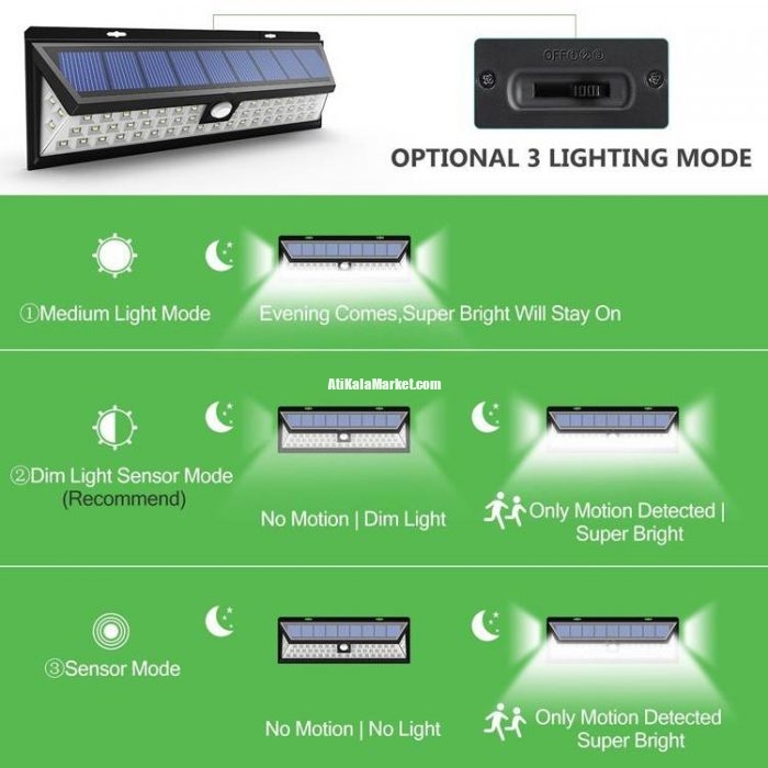 این چراغ هوشمند بدون نیاز به برق و سیم کشی روشنایی مورد نیاز شما را تامین می کند. این چراغ دارای دو سنسور تشخیص میزان روشنایی و تشخیص حرکت می باشد. سولار پنل این چراغ باتری داخلی آن را در روز شارژ می کند و در زمان تاریکی به کمک یک سنسور حساس، حرکت اطراف آن را تشخیص می دهد و در سه حالت مختلف روشنایی مورد نیاز را تامین می کند. طراحی منحصر بفرد آن باعث می شود روشنایی مورد نیاز شما در سه جهت تامین گردد.