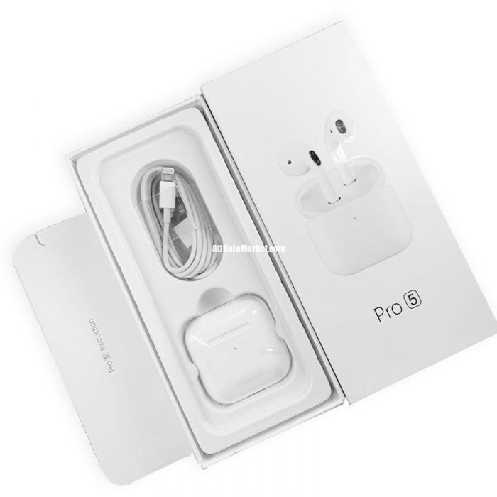 هدفون مدل Airpods Pro یکی از محصولاتی است که بسیار مشابه با مدل تولید شده توسط شرکت اصلی سازنده تولید شده است. این محصول از دو گوشی بیسیم و یک کیس شارژر تشکیل شده است. گوشیها هر کدام به رنگ سفید طراحی شده اند. این هدفون از طریق فناوری بلوتوث به دستگاه شما متصل شود تا به موسیقی دلخواه در گوشی موبایل خود گوش دهید. همچنین این هدفون از قابلیت حذف نویز (Active Noise Cancellation) بهره میبرد. ابعاد کیس همراه این هدفون هم برابر با 60.2 × 45.2 × 21.7 میلیمتر است؛ به این ترتیب با تمام شدن شارژ گوشیها میتوانید آن را در کیس شارژر قرار دهید. با توجه به کوچک بودن این کیس شارژر میتوانید آن را در جیب خود قرار دهید و همیشه همراه خود داشته باشید. این محصول همراه با یک شارژر و دو جفت سرگوشی با سایز مختلف ارائه میشود. در زمان استفاده از این محصول خیلی زود متوجه راحتی قرار گرفتن آن در گوش می شوید. لبههای سیلیکونی گوشیهای صدای مزاحم را از بین میبرند و کاری میکنند که بهجز صدای موسیقی صدای دیگری به گوشتان نرسد. نحوه طراحی هدفون به گونه ای است که با قرار گرفتن در داخل گوش صداهای محیط اطراف را بلوکه می کند. با وجود فناوری میکروفونهای هوشمند که در این هدفون قرار دارد، تماسهای تلفنی به همان راحتی گوش دادن به موزیک است. در دریافت یا برقراری تماسهای تلفنی هیچ مشکلی نخواهد بود. شاید بسیاری از افراد تجربه خوبی هنگام کارکردن با هدفونهای بلوتوثی ندارند و نزدیک نبودن میکروفون به دهان باعث میشود صحبتهای افراد بهوضوح شنیده نشود. اما این مشکل در هدفون Airpods Pro 5وجود ندارد. همچنین این محصول در برابر نفود قطرات آب مانند عرق مقاوم است. کیس شارژر این محصول دارای استاندارد Qi است که درواقع به دستگاه ها با قابلیت انتقال انرژی بیسیم تعلق می گیرد. فناوری شارژ وایرلس به شما این امکان را می دهد که در زمانی بسیار کوتاه تر از حالت معمول و بدون استفاده از کابل دستگاه خود را شارژ کند.