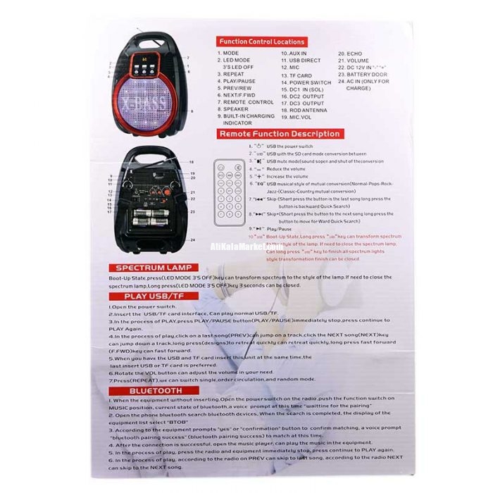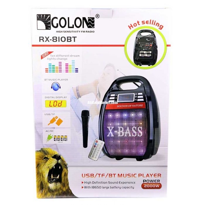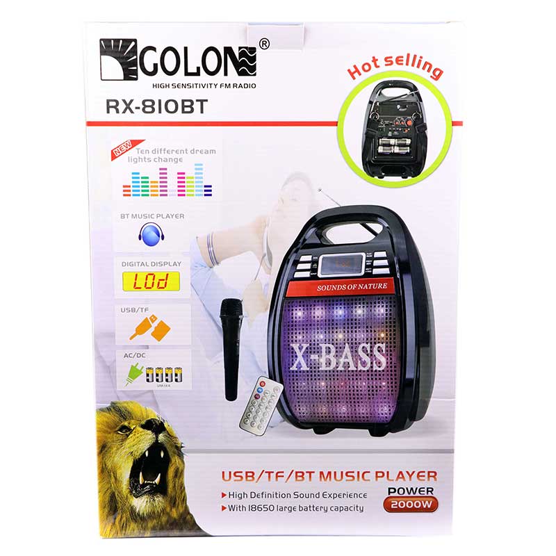 دستگاه مجموعه کامل آمپلی فایر بلند گو و میکروفون با اکو GOLON  مدلRX-810 BT   علاوه بر پخش موسیقی و فایل های صوتی با صدای بسیار قوی ، چه از طریق فلش مموری و کارت حافظه و چه از طریق بلوتوث ، قابلیت پخش صدای زنده با میکروفون بی سیم که به همراه دستگاه ارائه شده است را نیز دارا می باشد بطوری که در مجالس مختلف می توان از این دستگاه کامل برای اجرای مراسم ، بهره گرفت. به دلیل دارا بودن اکو  و نیز صدای قوی ، دقیقا” می توانید برای یک مجلس تا 100 نفره و حتی بیشتر از سیستم های اکو و …. که اجاره داده می شوند بی نیاز باشید .باتری داخلی دستگاه از نوع لیتیوم – یون می باشد که دوام خوبی دارد و ظرفیت شارژ بالایی دارد. رادیو FM و ورودی AUX  برای تقویت صدای دستگاههای با خروجی ضعیف نیز از قابلیت های این دستگاه می باشد .