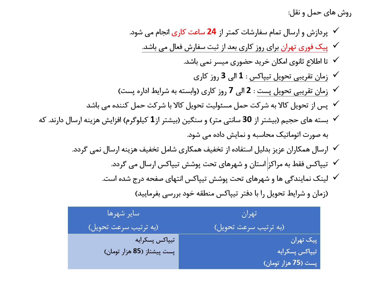 * فروشگاه در برابر ارسال به موقع سفارشات در بازه زمانی اعلام شده مسئولیت دارد لذا مسئولیت زمان تحویل کالا با شرکت حمل کننده شرکت پست، تیپاکس یا سایر شرکت های انتخابی شما جهت حمل کالا می باشد.